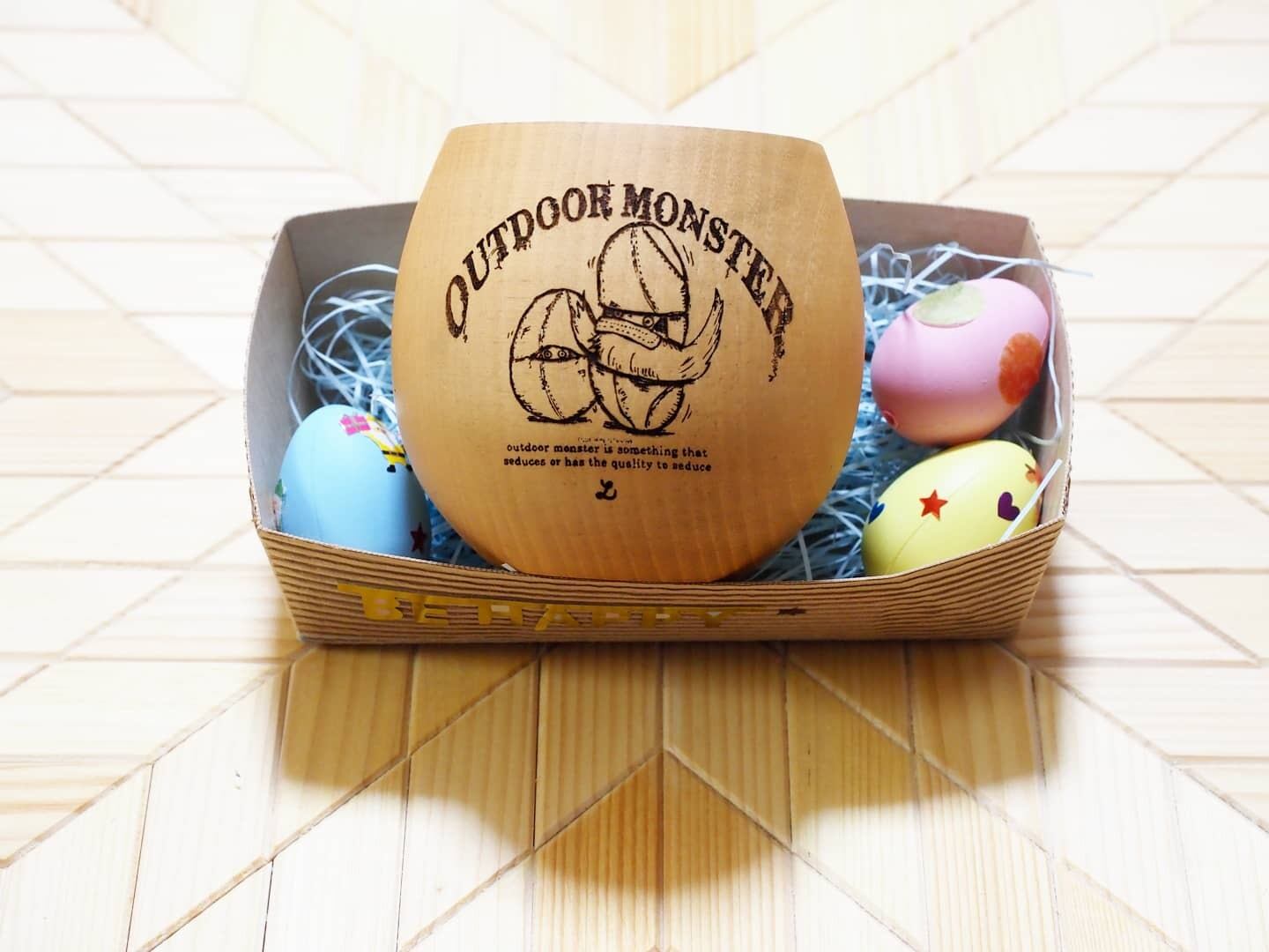 エッグカップという名前の通り、卵形のかわいらしい形に、卵形のアウトドアモンスターが刻印されています。